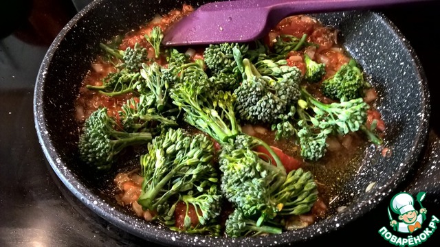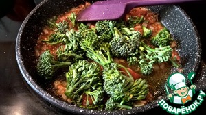 Когда соус готов, добавляем соцветья бейби брокколи. Важно не переготовить брокколи - тушим их в соусе минуты 3 - 5. Они должны стать слегка подвядшими, но не мягкими.
