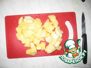 Картофель очищаем от кожуры и глазков, режем на одинаковые кусочки и опускаем в кипящий бульон.