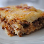 9. итак, берём форму, смазываем дно 2ст. л. белого соуса, кладём лаваш, наверх соус из фарша, посыпаем хорошо сыром, берём лаваш, намазываем 2 ст. л. белого соуса и кладём соусом на сыр, верх получается чистым, и опять фарш, сыр, лаваш, смазанный соусом, на сыр, и последний слой, фарш, сыр, лаваш, заливаем оставшимся белым соусом и посыпаем сыром.