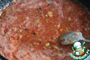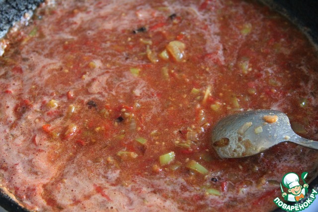 Добавить томаты в собственном соку, нарезанные кубиками, вместе с соком и воду (я использовала свежие помидоры и добавила немного рисового уксуса). Перемешать соус. Тушить соус под крышкой на среднем огне 5-7 минут.