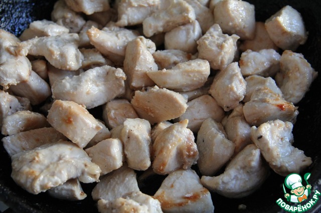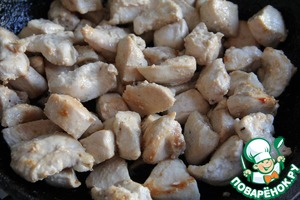 Куриное филе нарезать кубиками со стороной 2-3 см. Порционно обжарить куски куриного филе со всех сторон на растительном масле.