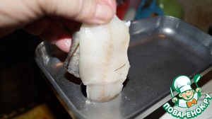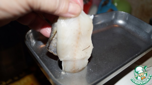 Минтай разделать на филе со шкуркой, свиную грудинку без шкуры, лук нарезать на кусочки, добавить горсть чесночных стрелок.