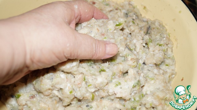 Фарш хорошо смешать, отбить, чтобы он стал пышным.