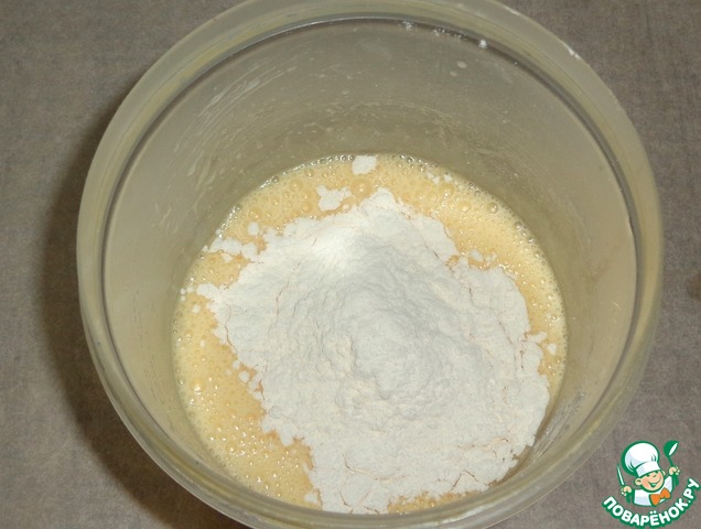 Насыпаем в тесто пшеничную муку с разрыхлителем. Размешиваем до однородности.