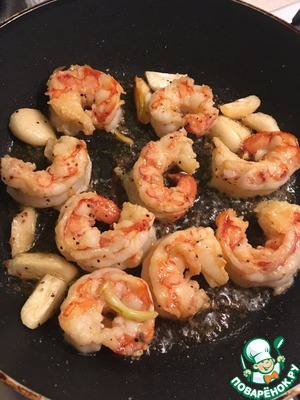 Смешиваем на сковородке растительное масло + маленький кусочек сливочного, добавляем чеснок нагреваем все до характерного приятного чесночного запахи и добавляем креветочки. Обжариваем по паре минут с каждой стороны. Достаем и откладывает пока в сторонку.