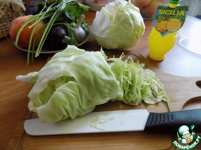 Капустные листья отделить от кочана и вырезать толстые прожилки. Скрутить листья рулоном и затем нарезать тонкой длинной лапшой. Мне так больше нравится, вы можете резать по-своему.