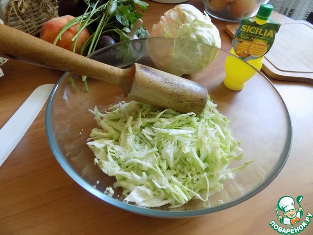 Выкладываем капусту в большой салатник, добавляем соль и сахар, перемешиваем и бьём мялкой до тех пор, пока капуста не даст сок. Я использую всегда деревянную мялку для этого.