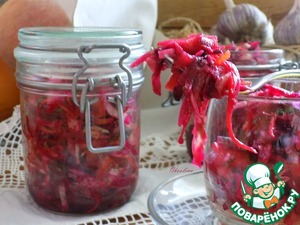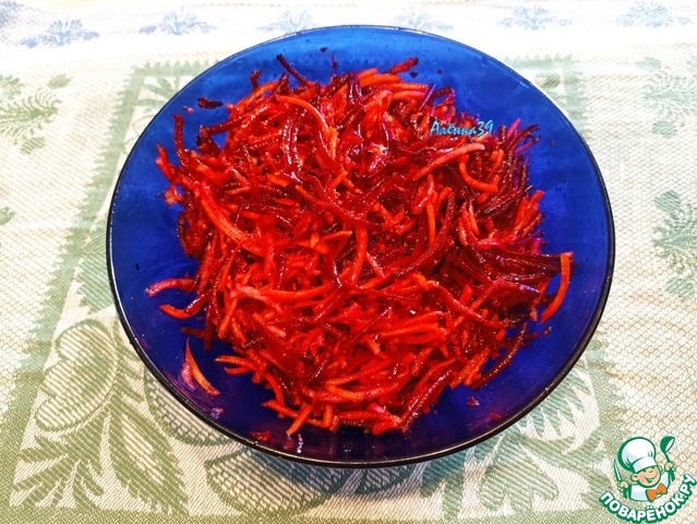 Свёклу я натёрла на средней тёрке, морковь-на корейской, лук порезала полу-кольцами, чеснок и петрушку мелко порубила. Режьте всё так, как вы любите! Тщательно перемешиваем овощи.