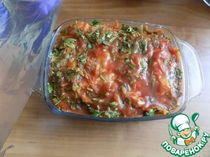 Присыпаем верх тёртой морковью, выкладываем в форму раздавленный чеснок, по желанию - колечки жгучего перца и сверху - рубленную мелко зелень.