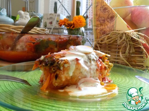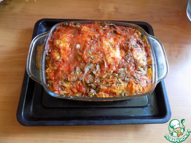 Ленивые голубцы из куриного фарша, цветной капусты и риса, запечённые с овощами в томатном соке.