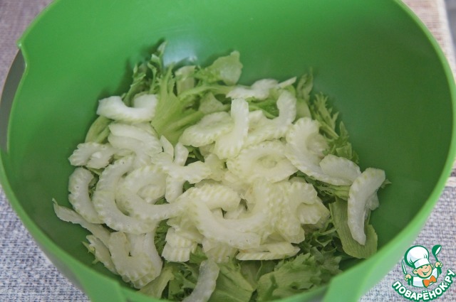 Овощи нарезать тонкими ломтиками. Последовательно добавить в миску сельдерей,