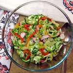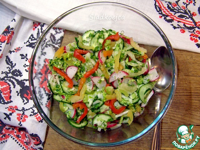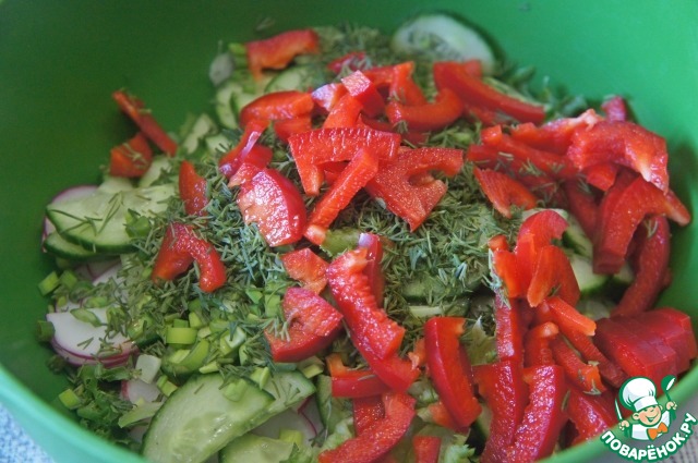 И болгарский перец. Все аккуратно перемешать в глубокой миске. Заправить сахаром и солью, полить маслом и уксусом и снова осторожно перемешать.