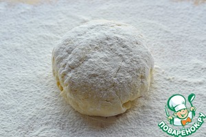Рабочую поверхность присыпать мукой. Выложить на нее тесто и обвалять его в муке.