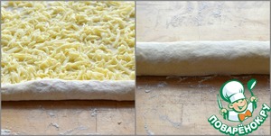 По всей поверхности теста равномерно распределить натертый на крупной терке сыр. -