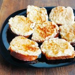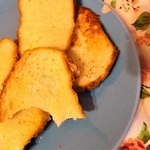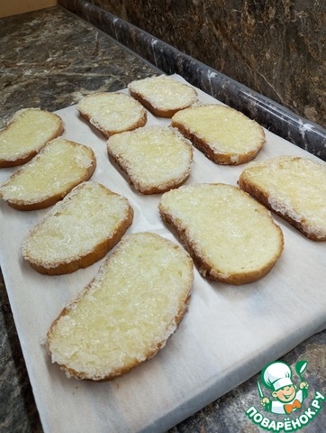 1. Багет, булочку, рожок или батон нарезать тонкими ломтиками.