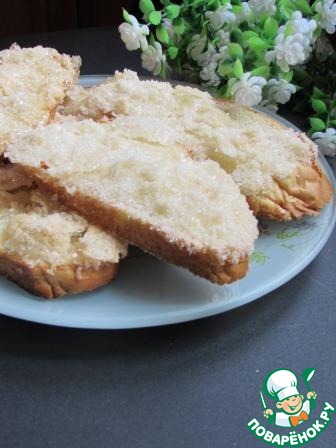 Остудить и подавать. Вкусные хрустящие гренки со сладкой сахарной корочкой по вкусу до боли напоминающие мои любимые язычки из слоеного теста. Если сахар был коричневым, то вкус немного карамельный. Очень вкусно с кофе или чаем.