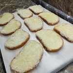 4. Обмакиваем кусочки хлеба с одной стороны в белок, потом сразу в сахар и выкладываем на противень, сухой стороной вниз.