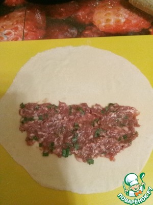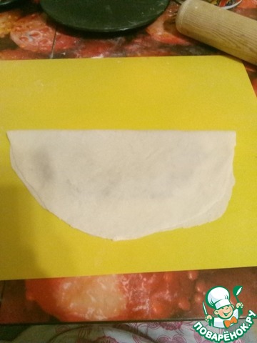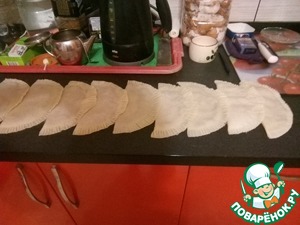 Раскатываем каждый по кругу, но не совсем тонко, чуть-чуть толще, чем на пельмени. Иначе тесто при жарке может прорваться и весь сок вытечет.