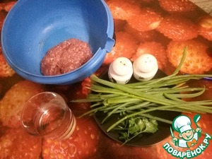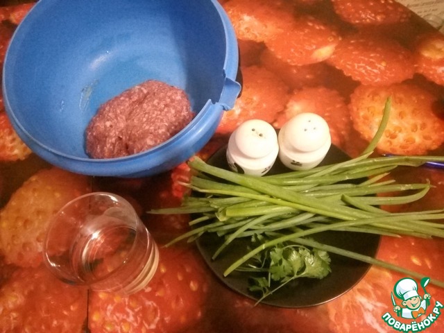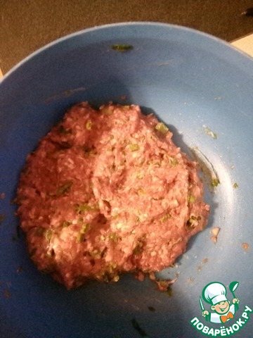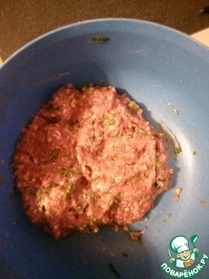 Берём все для фарша. У меня -фарш готовый, поэтому я просто нарезаю зелень (или перемалываю лук через мясорубку), добавляю соль и специи, холодную воду и перемешиваю.
