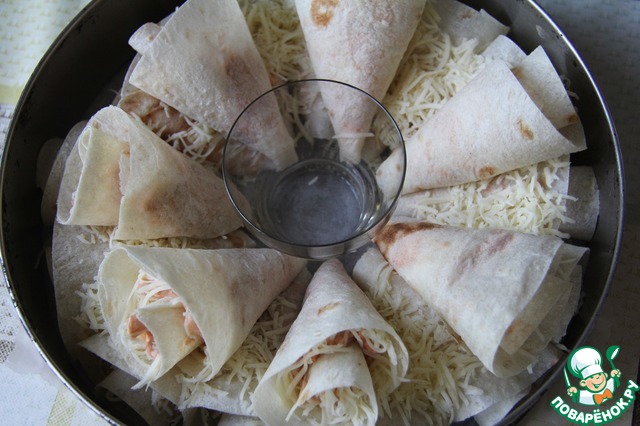 Присыпать оставленной частью сыра на первый слой конусов и уложить равномерно еще 7 конусов. Тут бы еще надо было посыпать сыром сверху, но я маловато его оставила.