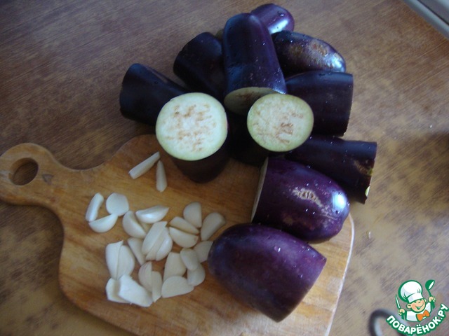 • Баклажаны разрезать поперек на две части, если баклажаны крупные, то на три. Чеснок нарезать на дольки, чтобы удобно было шпиговать им баклажаны. Можно для удобства чеснок смешать с солью.