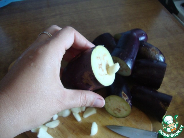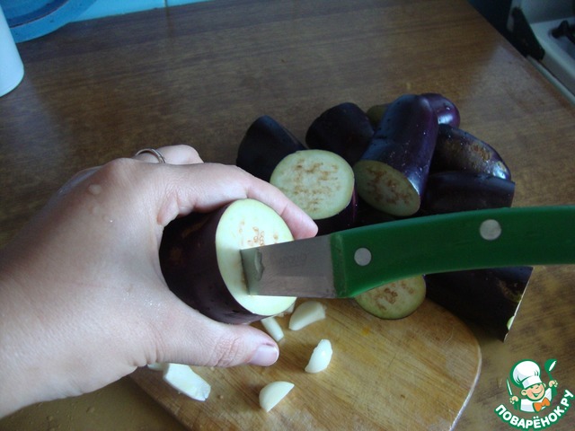 • И шпигуем баклажаны чесноком. Для этого делаем прорези ножом.