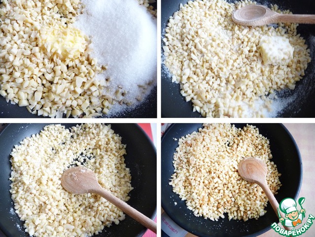 В сковороду выложить миндальную крошку, сливочное масло, сахар.