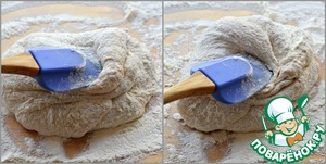 Затем опять же при помощи лопатки обвалять тесто в муке, складывая и прижимая края теста к центру. 10-12 таких складываний будет достаточно.