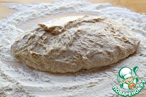 Оставшиеся 50 граммов муки просеять. Присыпать мукой рабочую поверхность. При помощи лопатки выложить тесто в муку.