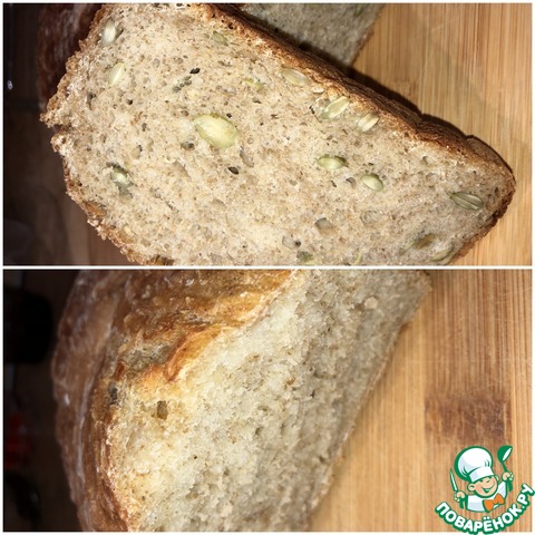 Выпекать хлеб в хорошо разогретой духовке при 200° 40-45 минут. Но стоит всегда учитывать особенности своей техники! Если верхняя корочка станет сильно румянится, то просто прикройте ее фольгой.