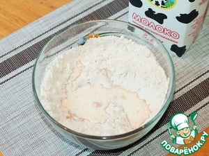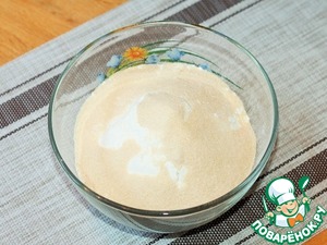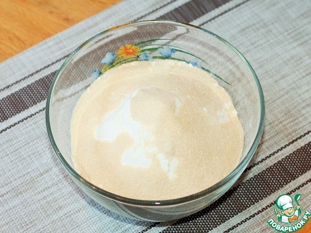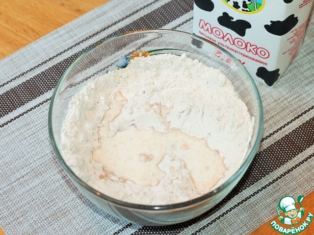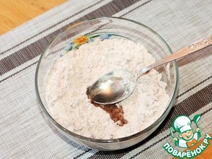 4. Соду погасить в 1 столовой ложке лимонного сока SICILIA. В мучной смеси, делаем в середине углубление и выливаем лимонный сок (3 ст. л.).