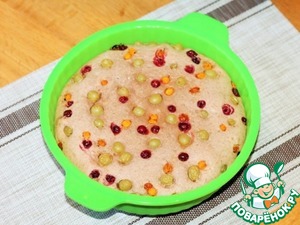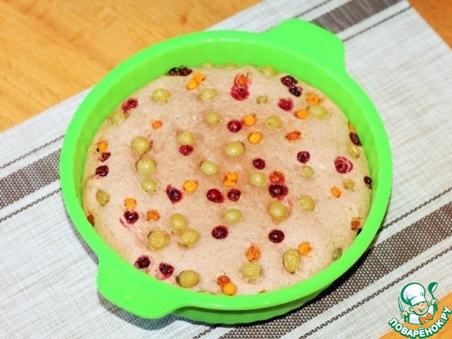11. Сверху, я посыпала пирог промытой и подсушенной (бумажным полотенцем) мелкой ягодой. Ягоду лучше немного утопить в тесте. Отправляем форму с тестом в разогретую до 190 градусов С духовку на 15 минут, после этого снижаем температуру в духовке до 170 градусов С и выпекаем пирог еще 30 минут. У меня газовая плита.
