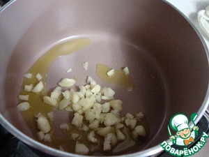 В сотейник добавить масло и очищенный крупно нарезанный чеснок.