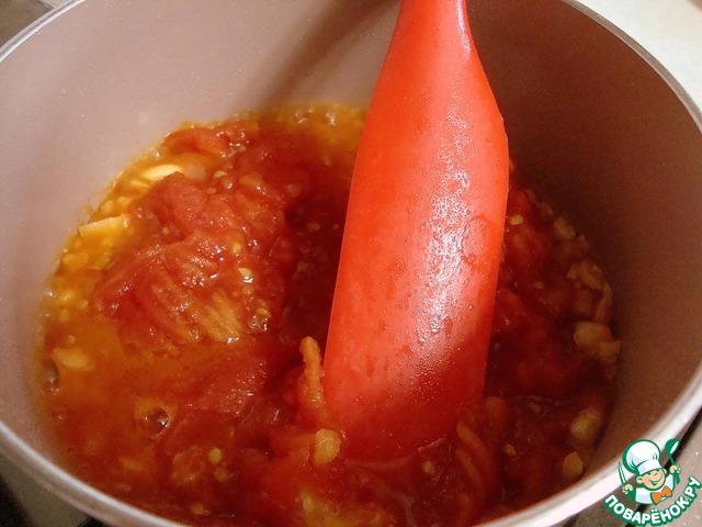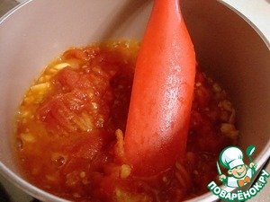 Добавить нарезанные маленькими кубиками помидоры и тушить минут пять.