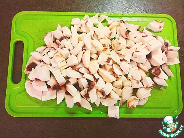Ломтики свиной ветчины нарезаем квадратиками и разделяем слипшиеся части.