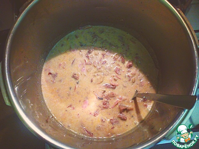 В финале добавляем ветчину, сметану и картофельный крахмал (можно и муку) в качестве загустителя соуса.