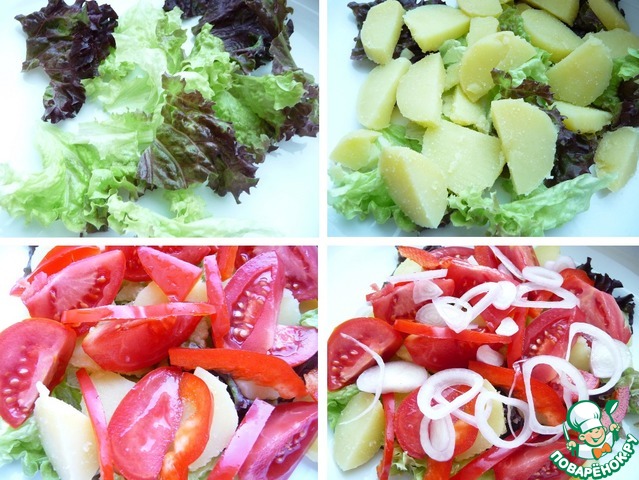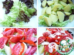В тарелку нарвать листья салата.