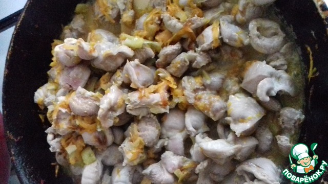 Влить тонкой струйкой молоко и слегка проварить на медленном огне. Затем добавить муку и помешивая венчиком варить до легкого загустения массы. Корочкой быть не должно. Влить массу в сковородку с желудка ми и тушить помешивая 15 минут.