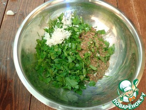 К зелени добавить измельченный чеснок, приправу, перец черный.