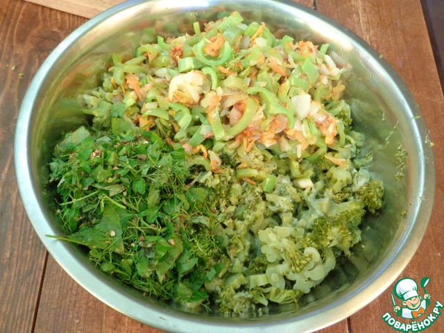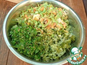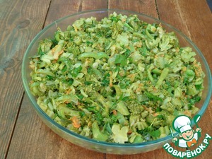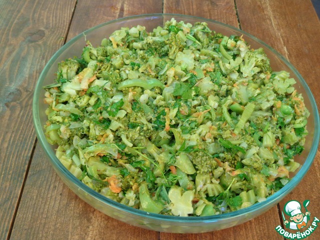 Сделать пережарку из порезанного репчатого лука и сладкого перца, шинкованной моркови. Добавить пережарку, зелень и яйца к брокколи.
