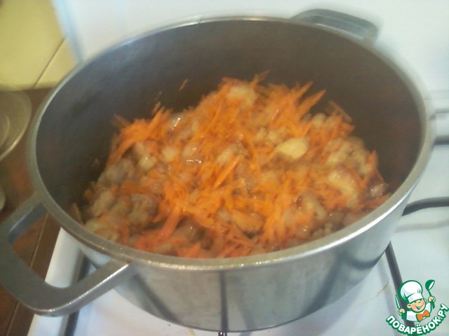Морковь натереть на крупной терке и добавить к мясу и луку. Слегка обжарить, добавить немного соли и перца, перемешать, добавить немного воды. Убавить огонь и дать потушиться минут 20.