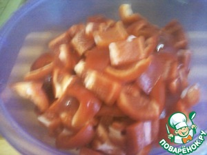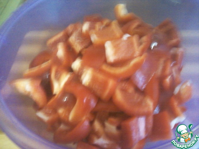 Перец очистить и промыть, нарезать полосками 1,5 см.