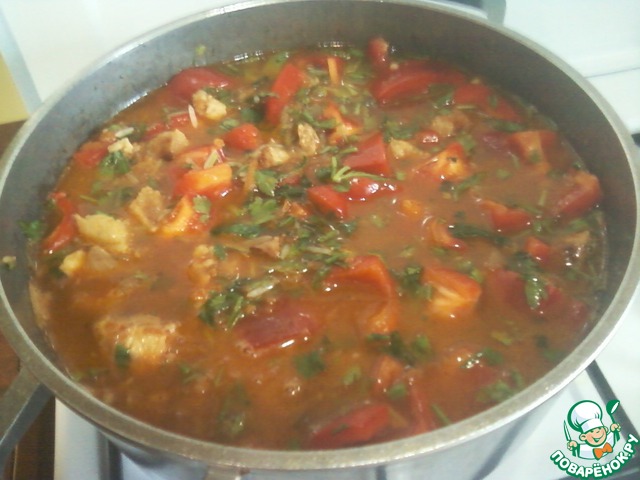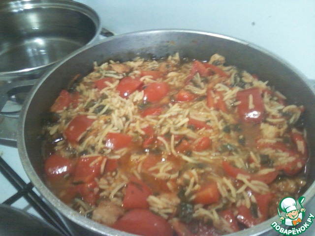 В общем она купила пачку готовых охлажденных куриных котлет, запихала в перцы и варит в подливе из томатной пасты и воды...