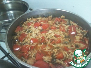 Убавить огонь, накрыть крышкой и варить до готовности риса.