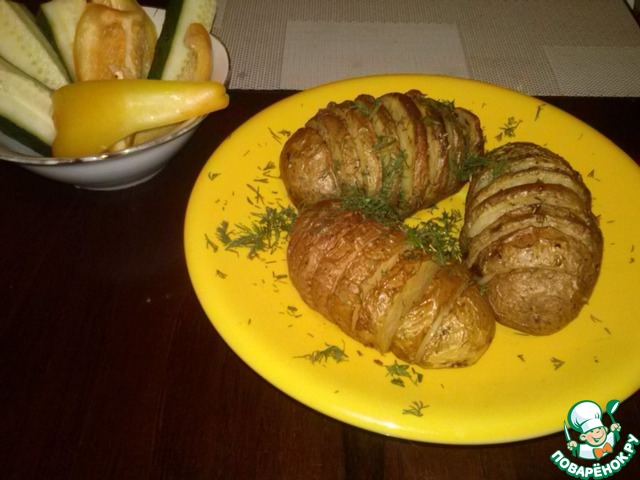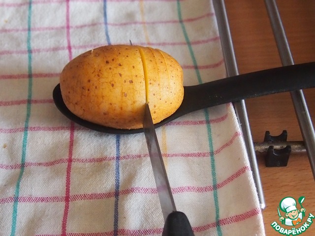 Картошку нарезать тонкими ломтиками, не прорезая насквозь. Для этого я пользуюсь глубокой ложкой. Положить картофелину в ложку и острым ножом нарезать ломтики, так картофель не прорежете насквозь.