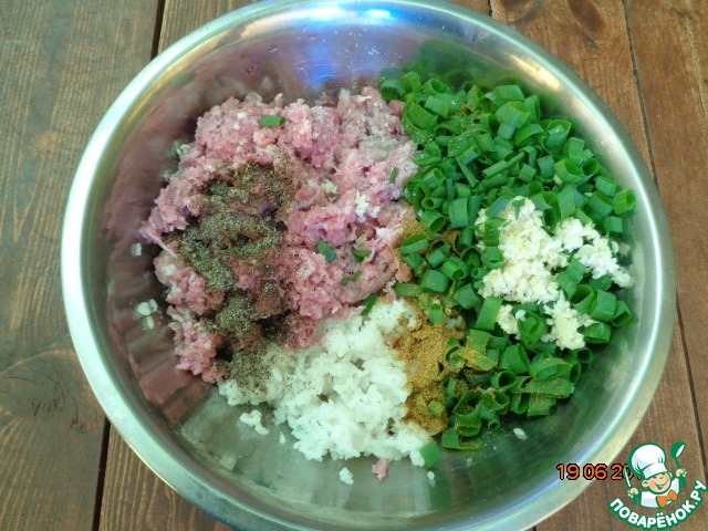 Приготовим фарш: рис отварим 15 минут. Зеленый лук нарежем. Чеснок измельчим. В мясной фарш добавим рис, соль, приправу, чеснок, зеленый лук, черный молотый перец. Всё тщательно перемешаем.