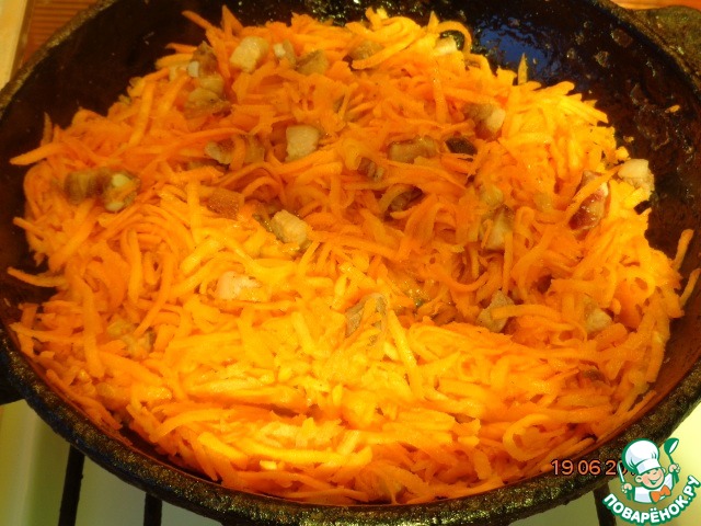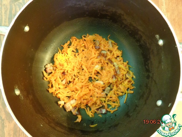 Для прослойки копченое сало порежем, поджарим минуты 2, добавим нашинкованную на крупной терке морковь и пожарим еще 4 минуты, помешивая.