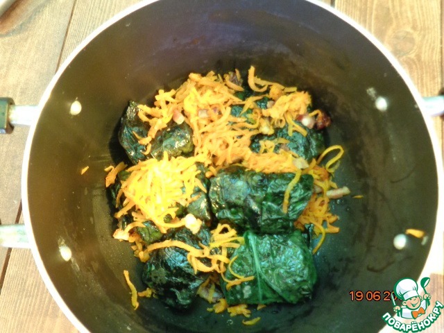 Обжаренные голубцы кладем на морковную прослойку и чередуем: голубцы - морковная прослойка.