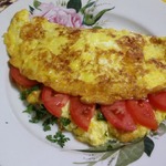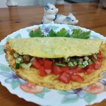 Выложить кубики помидора на половинку омлета. Посолить, присыпать зеленью. -