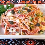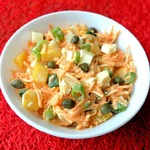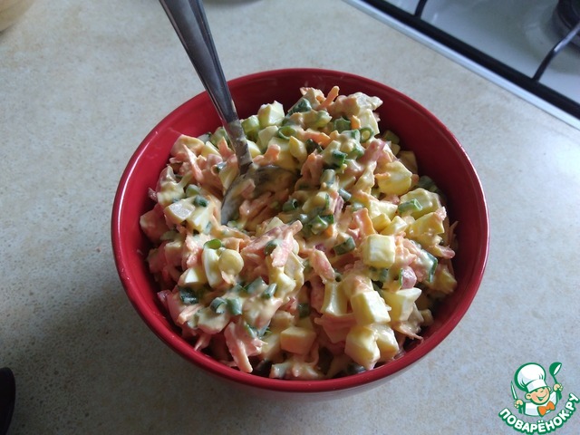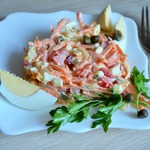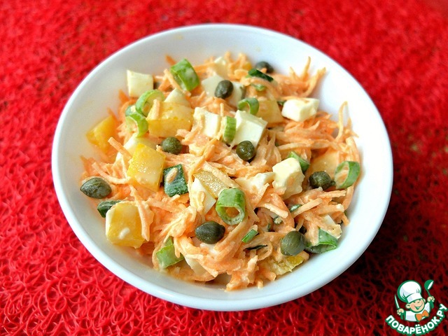 Складываем в миску морковь, сладкий перец, зеленый лук и каперсы, добавляем майонез и сметану, хорошо перемешиваем, потом добавляем яйца, все солим, перчим свежемолотым перцем и снова перемешиваем